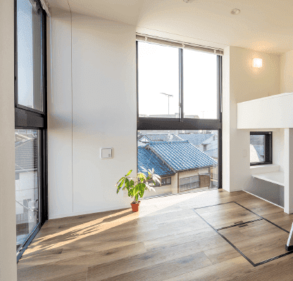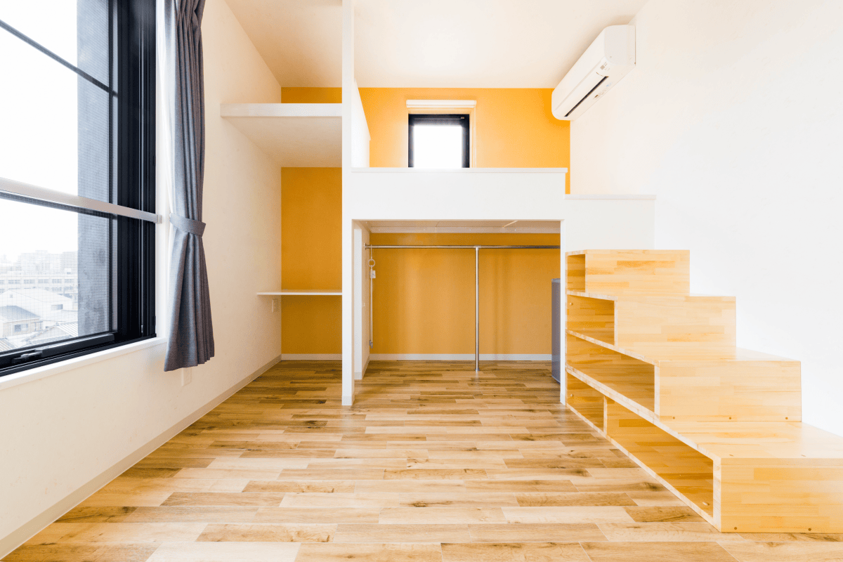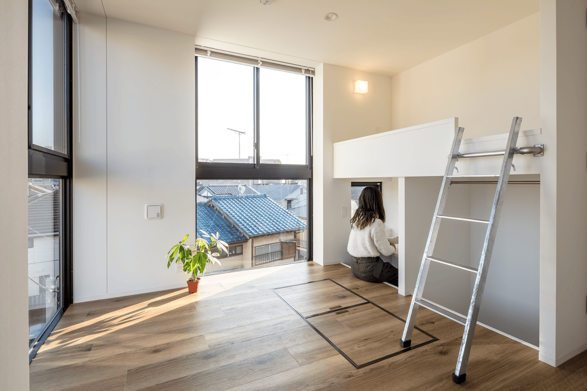 大きな窓から差し込む自然光が気持ちよく、広めのワンルームかつ立体的な使い方をして、過ごしやすい空間を実現。