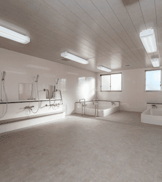 個室はミニマムな空間及び設備とし、小集団ごとにキッチンや浴室を完備させる。